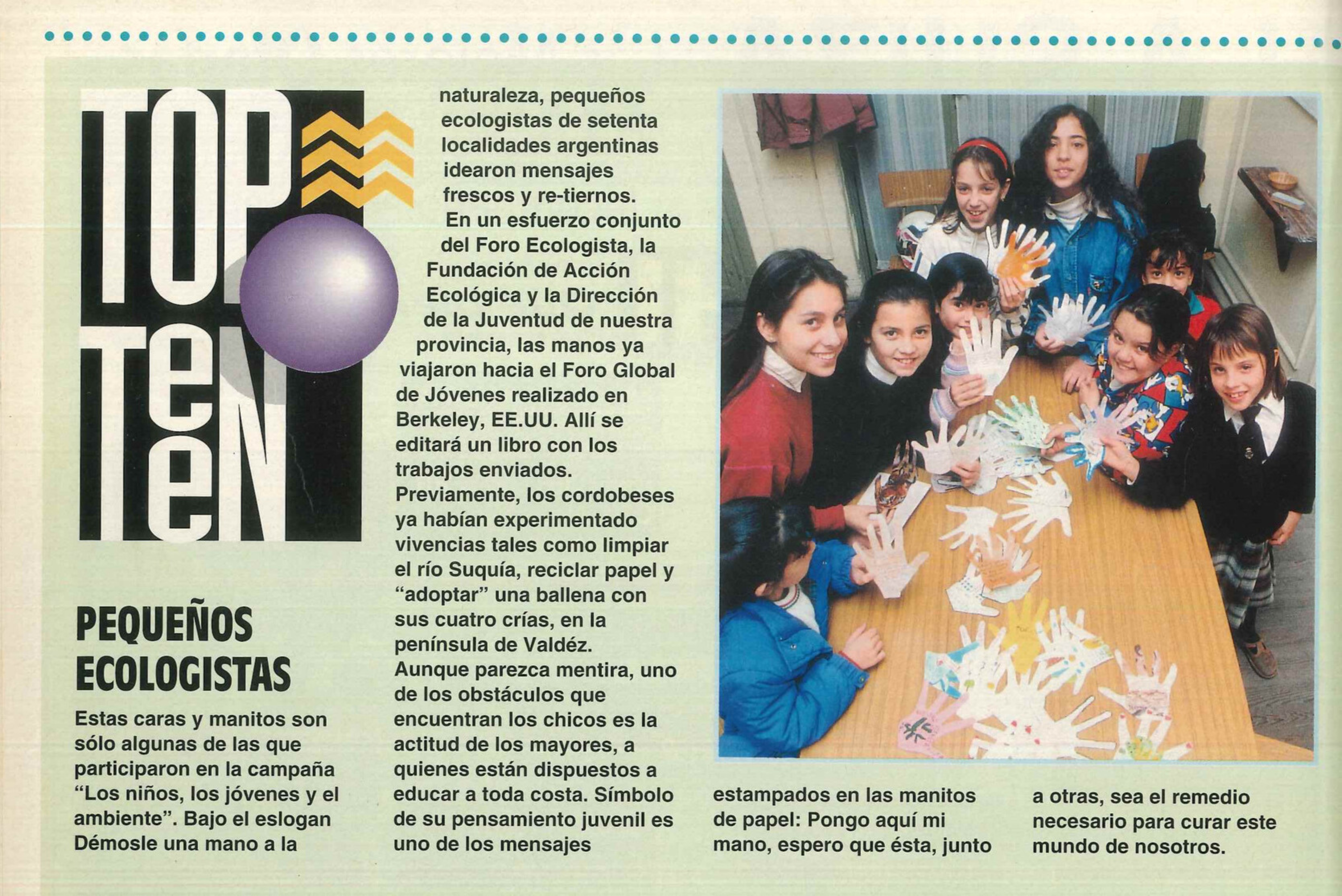 La Campaña Los niños, los jóvenes y el ambiente es organizada por Foro Ecologista y se lleva a cabo desde el año 1990. Ya han participado en ella estudiantes, docentes y padres de más de 100 localidades argentinas; desde el año 2001 se han sumado al trabajo instituciones de otros países hispanoparlantes.